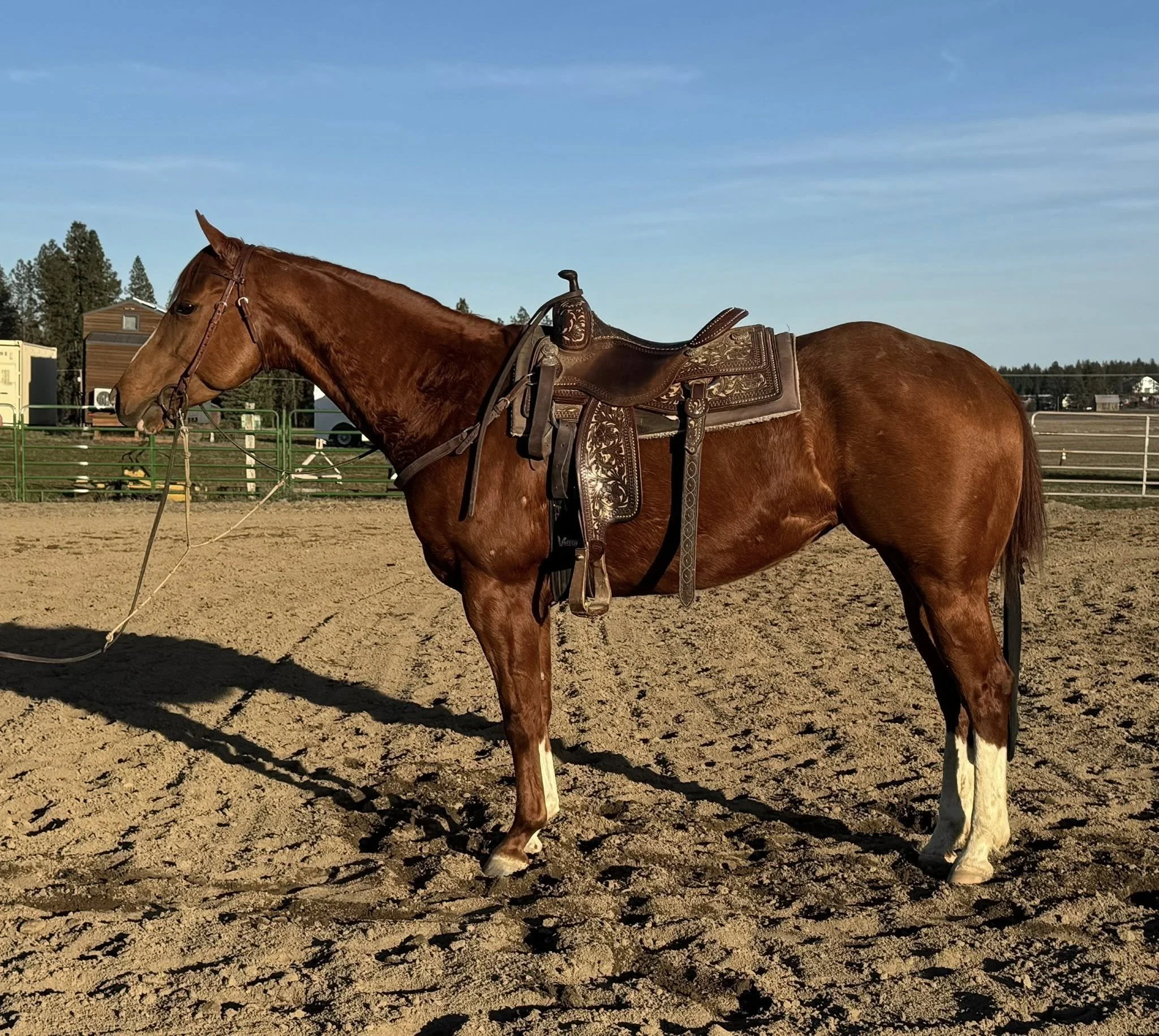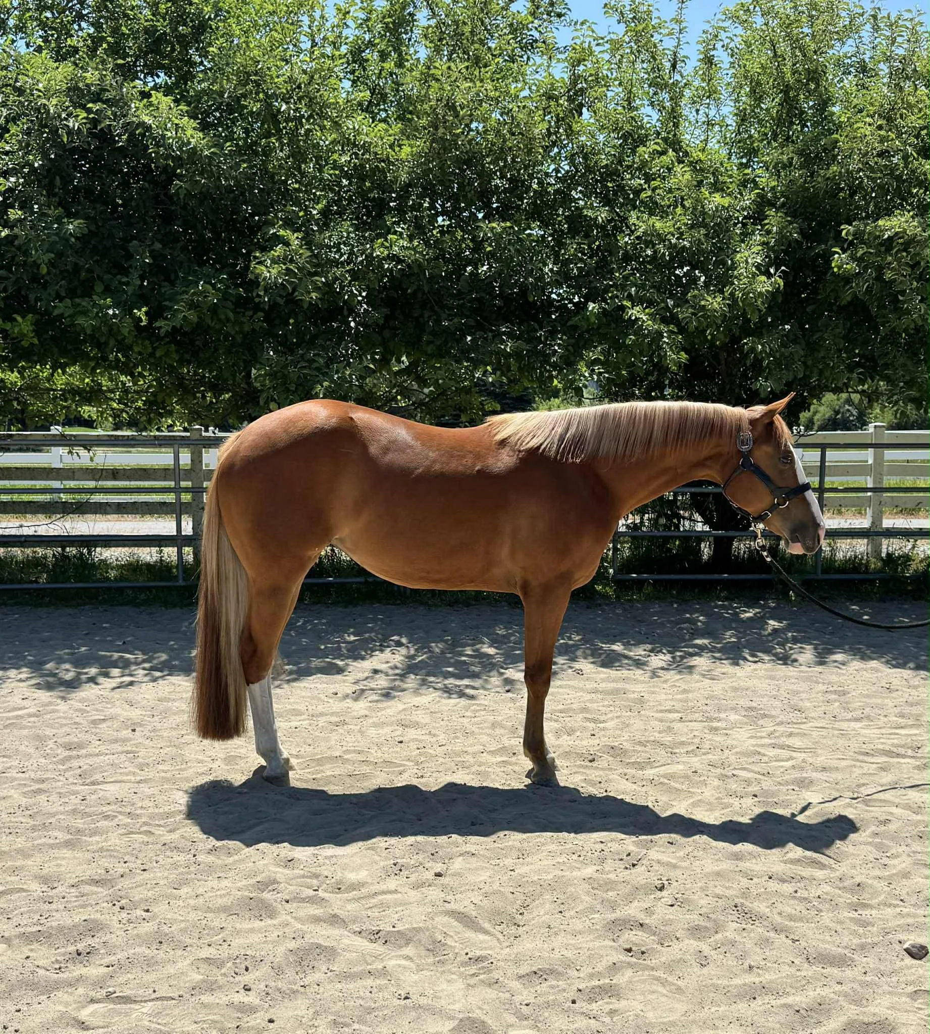 2023 APHA sorrel mare by The Born Legacy out of a Zippo Pine Bar mare. Premier Sires nominated. Futurity Champion and won about 1,100 in the lungeline, shown twice. She has about 30 rides and is as easy as they come. She has a great feel, great legged, and has the mind to be a big time show horse. She has the brain every horse trainer wants. Easy enough for a DIY amateur. Can’t say enough good things about his one. She has a bright future ahead of her. Priced to sell 15,xxx. Special consideration if she stays in the barn. PM or Contact Alex directly
